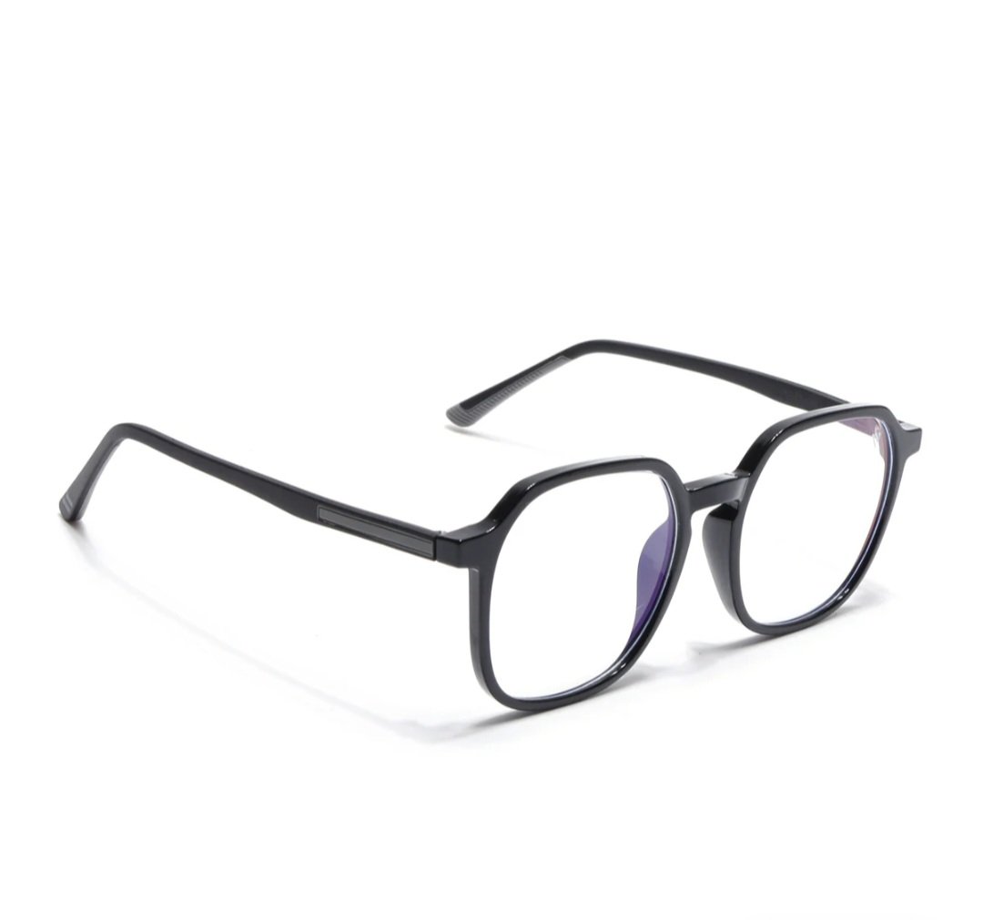 Black rectangular eyeglass frames with a modern geometric design and clear lenses.