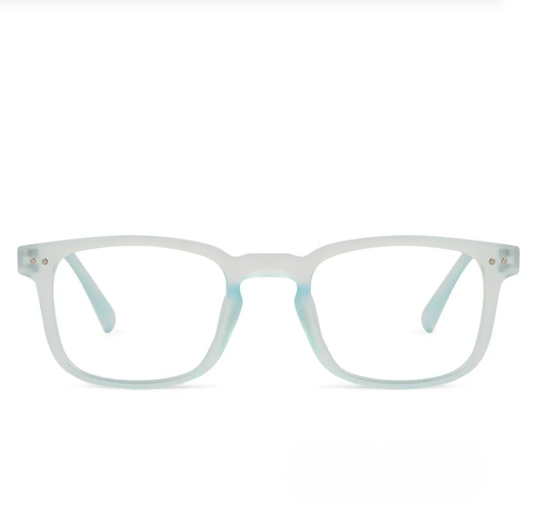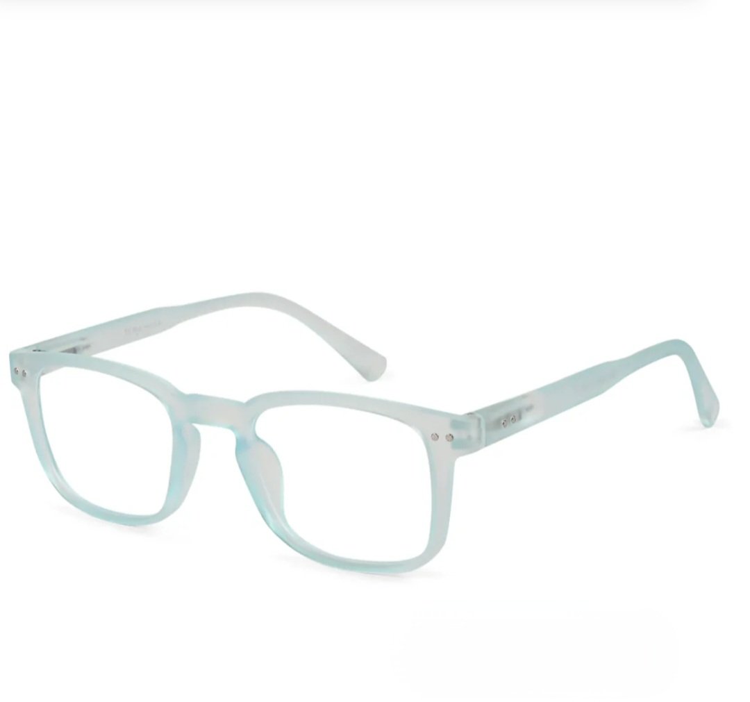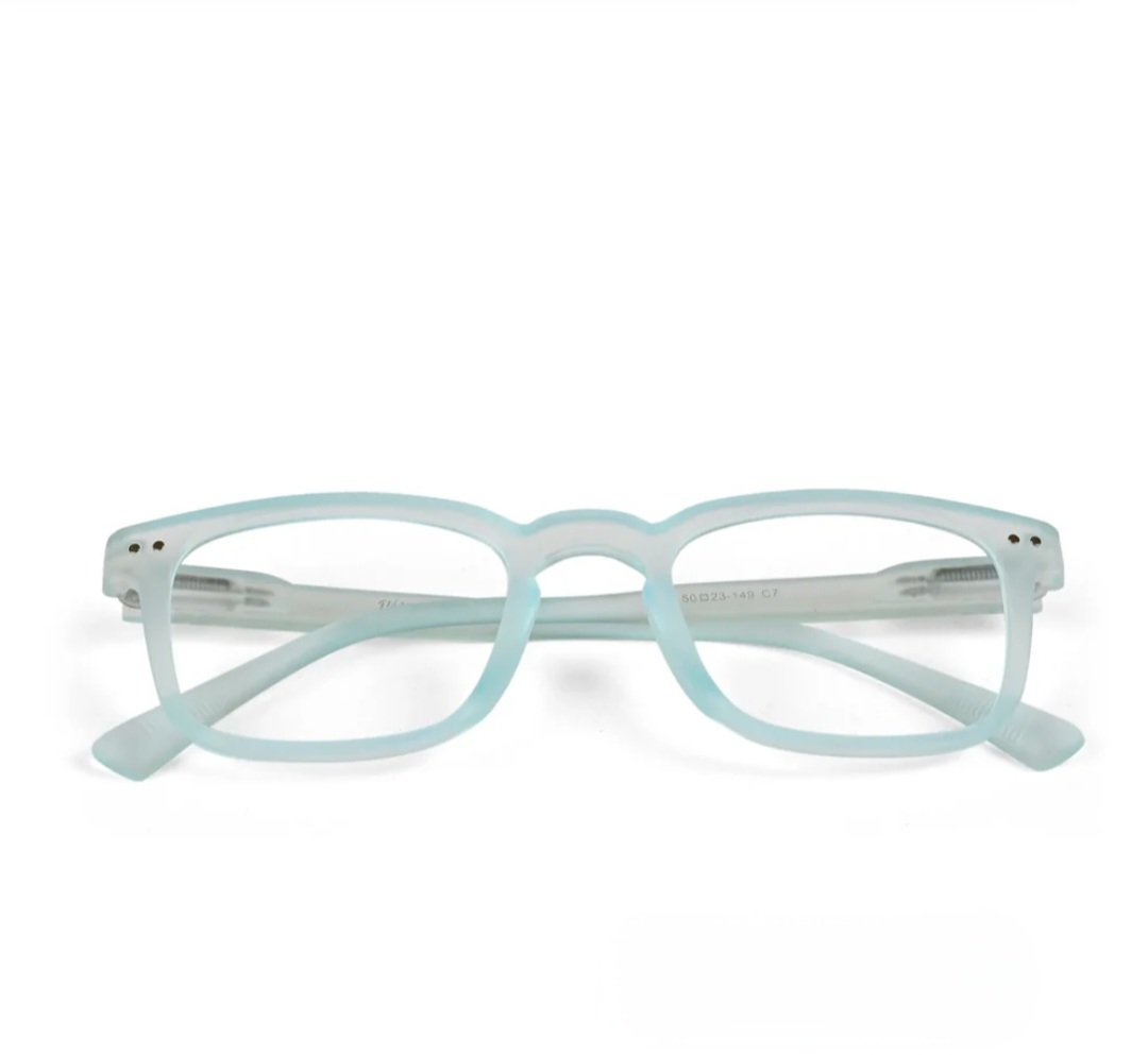 These are stylish rectangular reading glasses with a translucent light blue (mint/aqua) matte frame. They feature a classic wayfarer-inspired shape, silver rivet accents on the front corners, and matching light blue temples. The overall look is modern, minimalist, and semi-transparent.