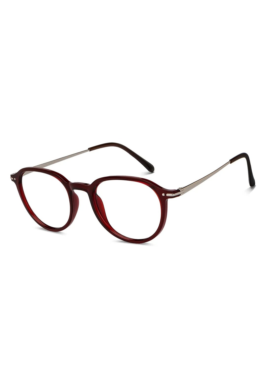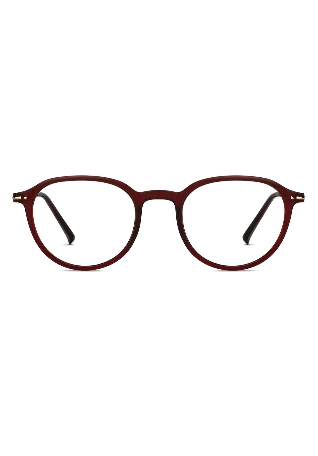 “Stylish round full-rim eyeglasses with a glossy maroon (wine-red) frame, keyhole nose bridge, and thin temples with metallic accents at the hinges. Lightweight and modern minimalist design, perfect for both men and women.”
