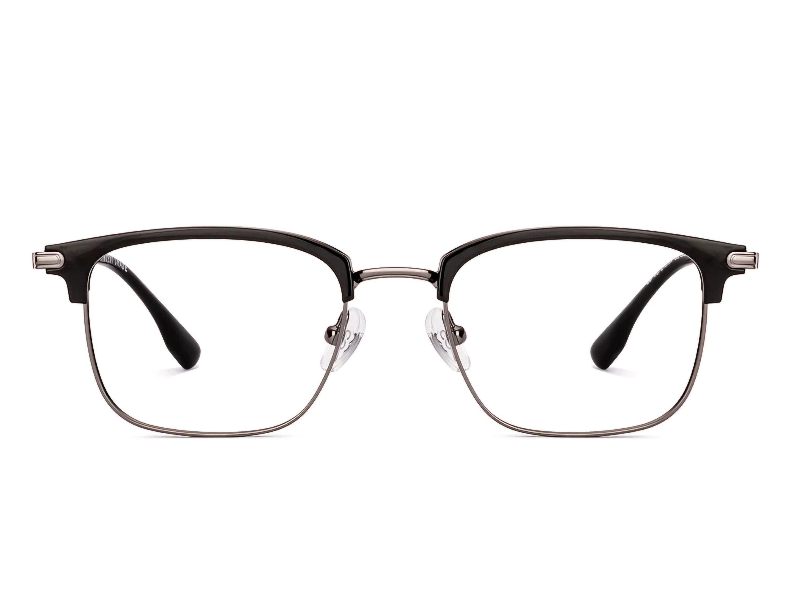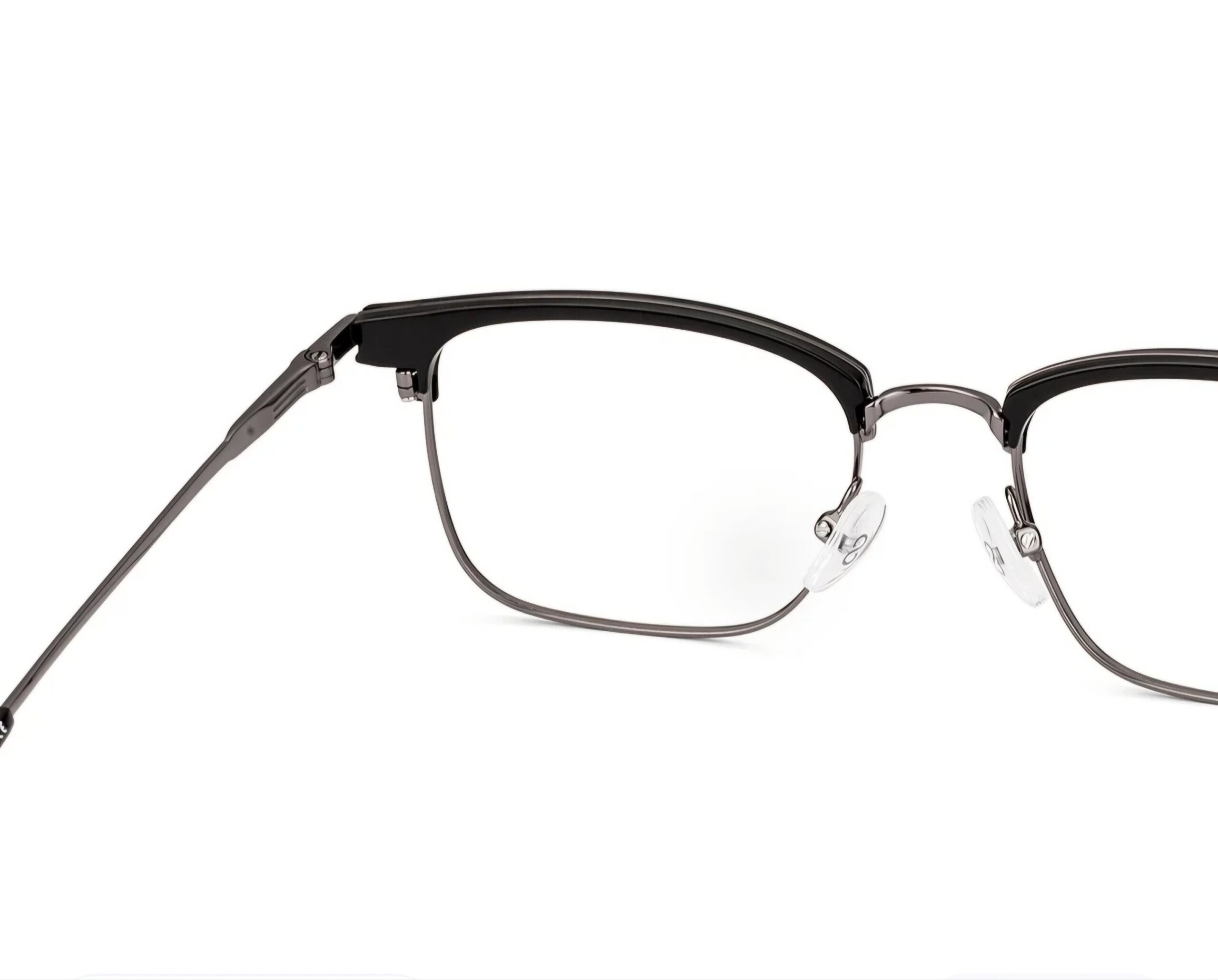 “Stylish half-rim clubmaster eyeglasses with a matte black upper frame and shiny gunmetal lower rim. The sleek metal bridge and adjustable nose pads offer comfort, while the classic browline design gives a smart, retro-modern look. Perfect for both men and women.”